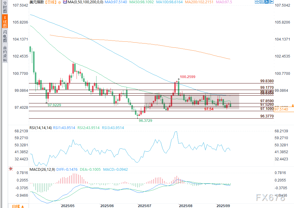 尽管当前通胀数据呈现企稳态势,但申领失业金人数激增凸显劳动力市场疲软,交易员对美联储下周至少降息25个基点的信心正不断增强。美国国债收益率或在当前水平附近获得一定支撑,但除非劳动力市场数据企稳,否则美元指数可能再度测试97.109的支撑位。短期来看,除非美元指数能明确突破97.859-98.100这一阻力区间,否则美元的看空基调难有改变。北京时01:37,美元指数报97.5330/570,跌幅0.31%。